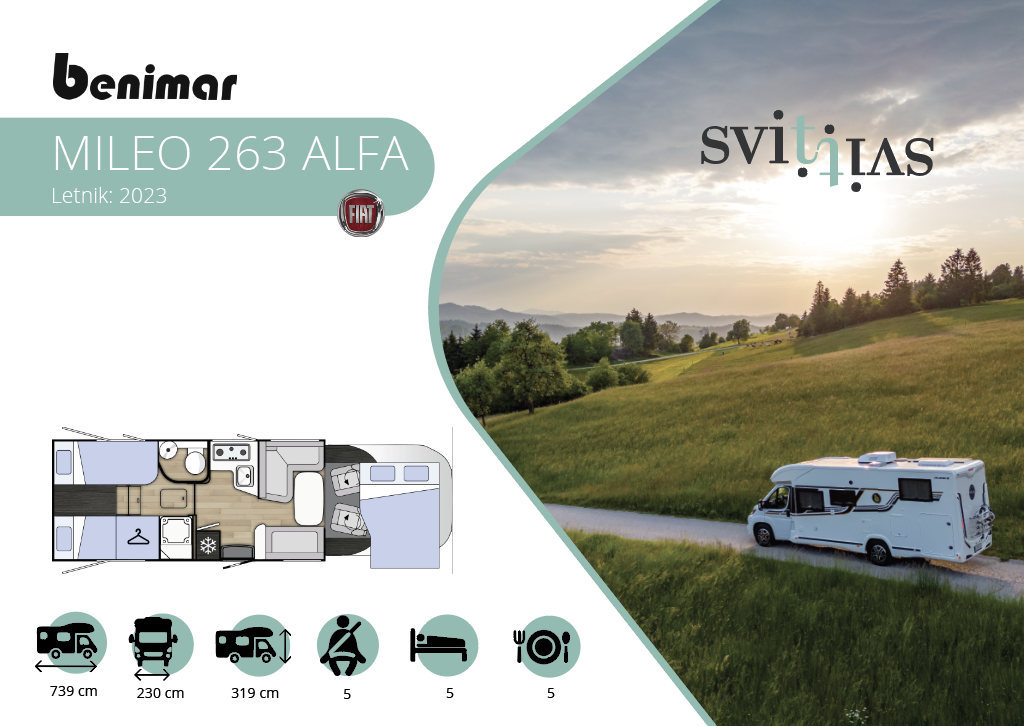 Avtodom Benimar Mileo 263 Alfa je izdelan na podvozju Fiat Ducato 2,2 140KS. Ima avtomatski 9-stopenjski menjalnik, da je vaša vožnja še bolj udobna in lahkotna. Je dobro opremljen, saj ima ABS, ESP, 2 zračni blazini, bivalno klimatsko napravo, tempomat …