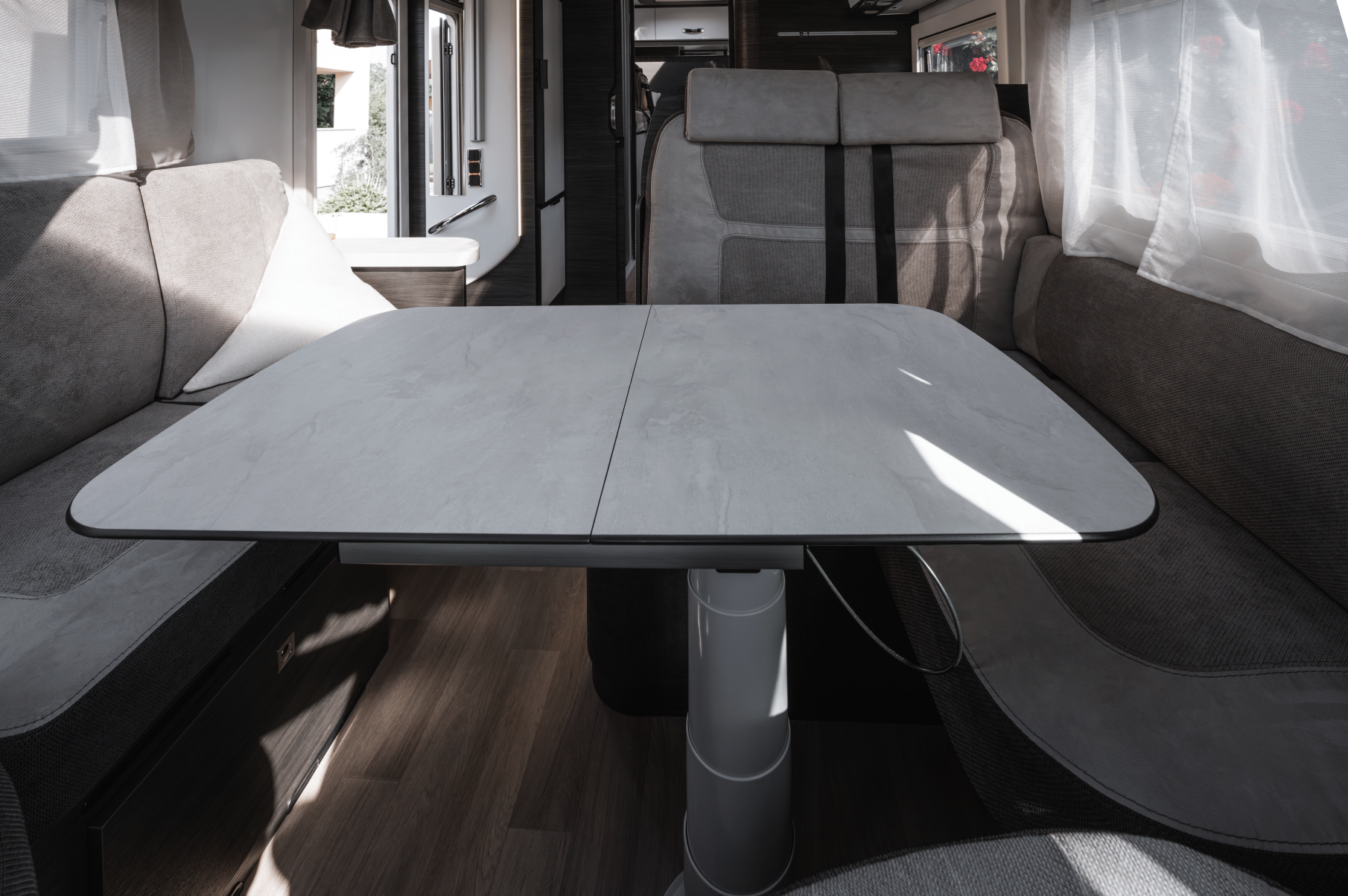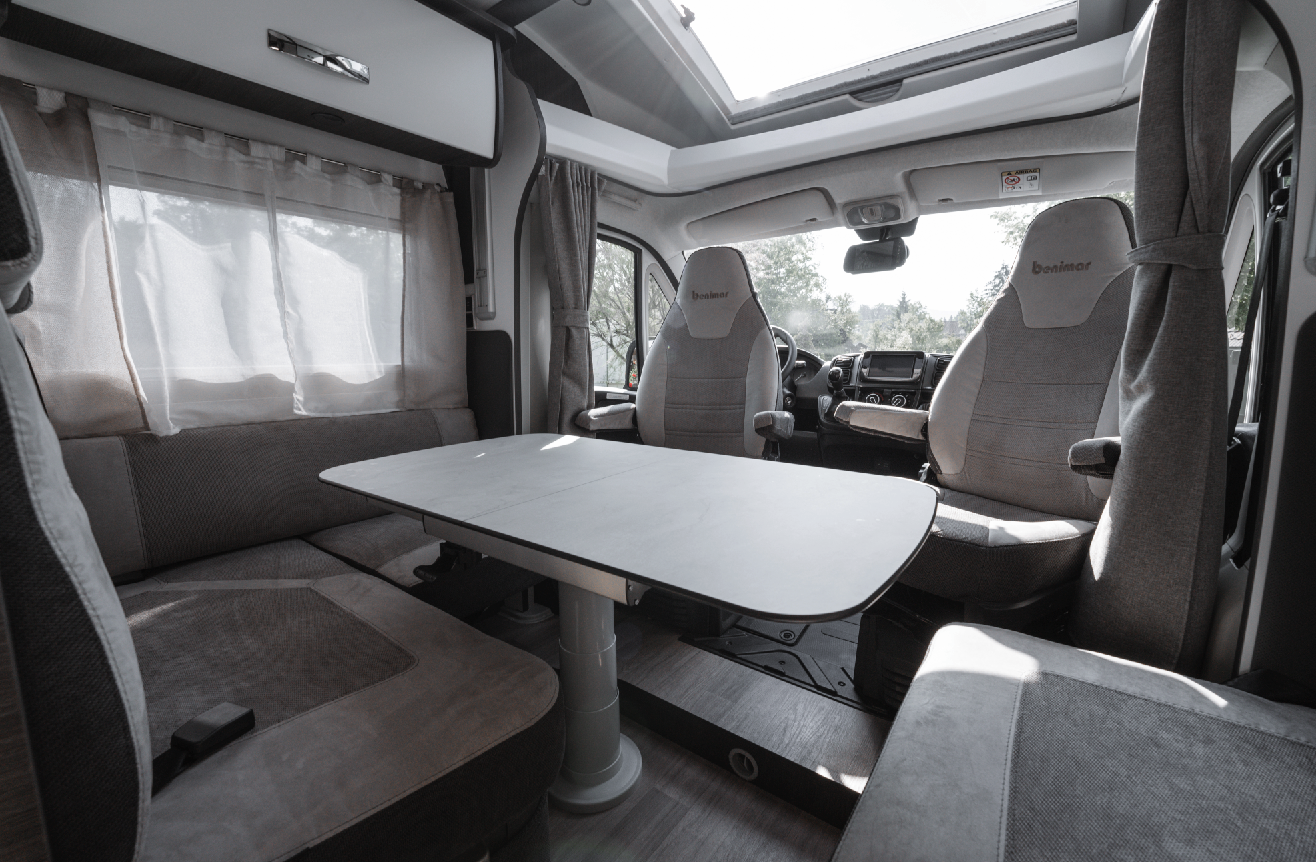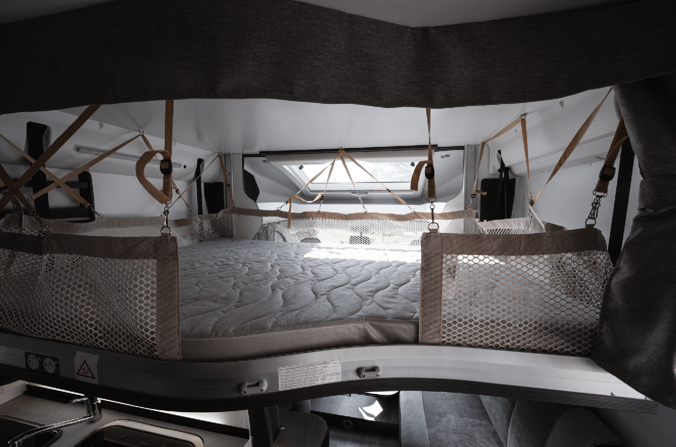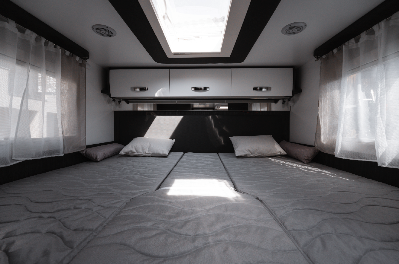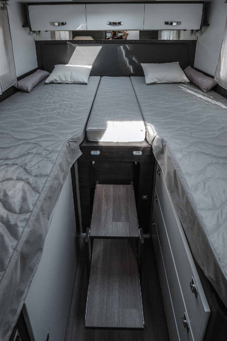 Avtodom je registriran za 5 oseb in prav toliko jih lahko v avtodomu tudi biva. V zadnjem delu avtodoma je vedno pripravljena postelja za 2 osebi, ki se lahko s pomočjo izvlečne police in dodatne blazine enostavno spremeni v posteljo za 3 osebe. V sprednjem delu pa ima avtodom električno dvižno posteljo, ki je čez dan »pospravljena«, zvečer pa se jo s pritiskom na stikalo spusti do spalne lege.