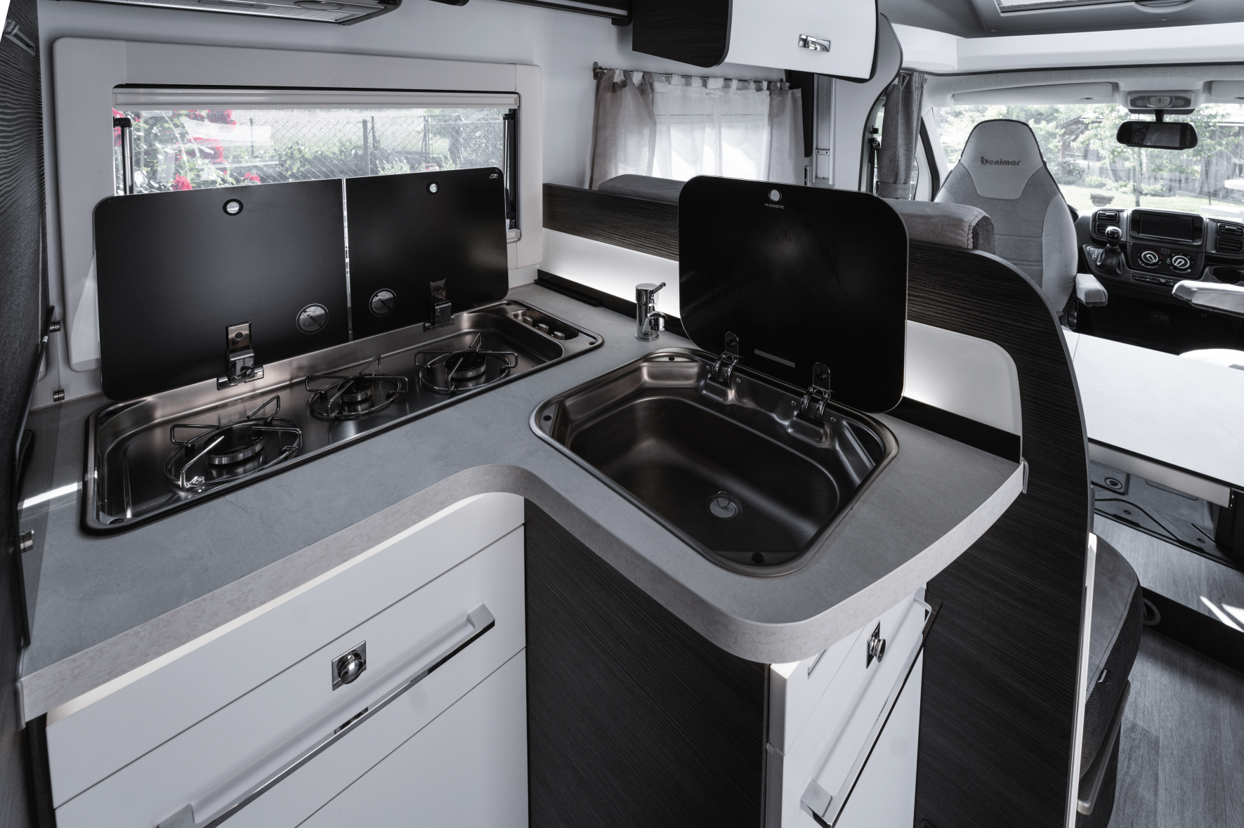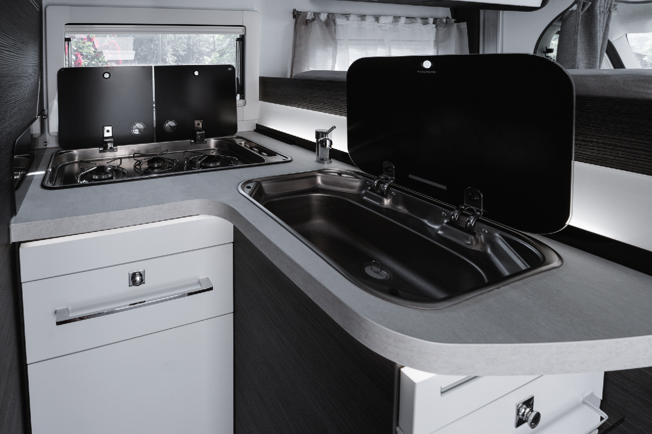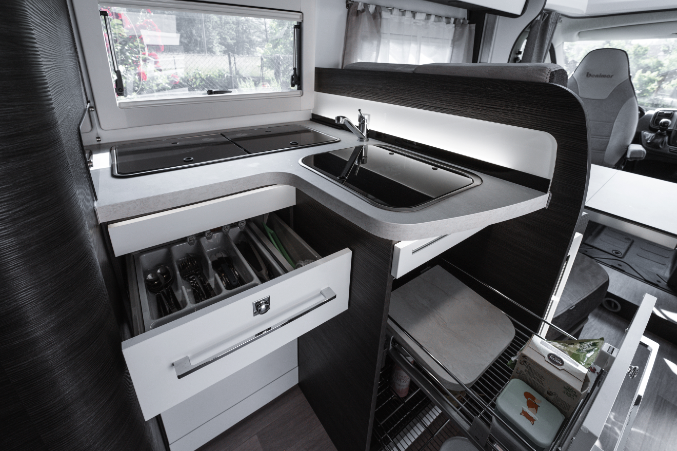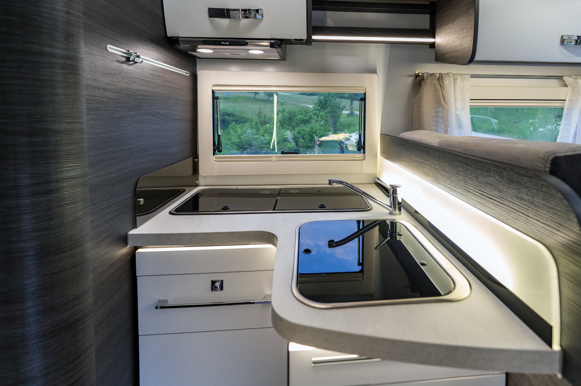 Kuhinja je opremljena s troplamenskim štedilnikom in velikim hladilnikom (140 litrski), ki ima ločen predal za plastenke in zamrzovalnik. Hladilnik vam omogoča avtomatski preklop med izborom energije (plin, 220V, 12V).